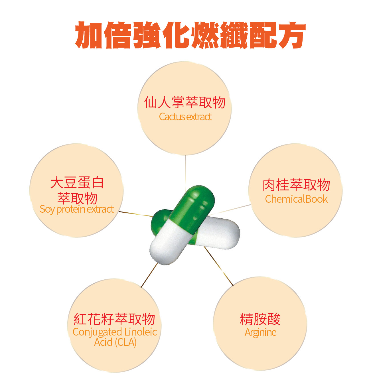 成 分:大豆蛋白萃取物(含苯丙胺酸、纈胺酸、蘇胺酸、色胺酸、異白胺酸、白胺酸、甲硫胺酸、精胺酸、離胺酸、組胺酸)、紅花籽萃取(含CLA共軛亞麻油酸)、仙人掌萃取物、肉桂萃取物、麥芽糊精